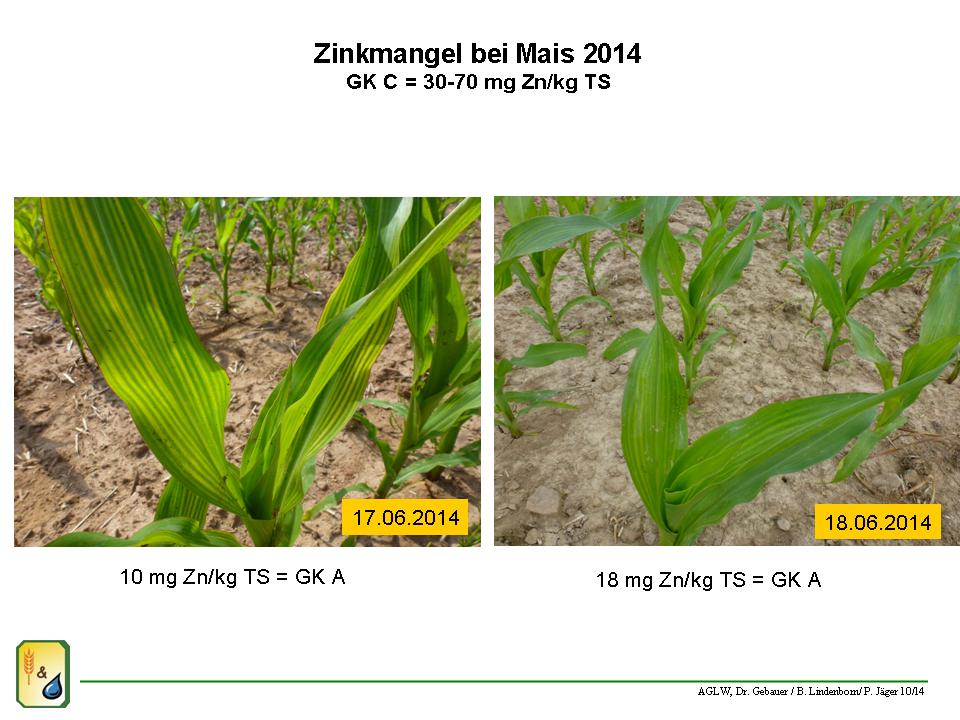 Um festzustellen welche Bedeutung eine Zn-Düngung für den Ertrag von Mais und Weizen besitzt, bei letzterem auch für den Eiweißgehalt, dann sollten Sie als Landwirt eine Zn-Düngung bei Mais (700 g/ha) oder Weizen (350 g/ha) durchführen. Lassen Sie 2 Spuren unbehandelt (Zn-Düngung bis EC 32 oder ab EC 37). Die AGLW ist gerne bereit, entsprechende Ertrags- und Qualitätsuntersuchungen durchzuführen.
